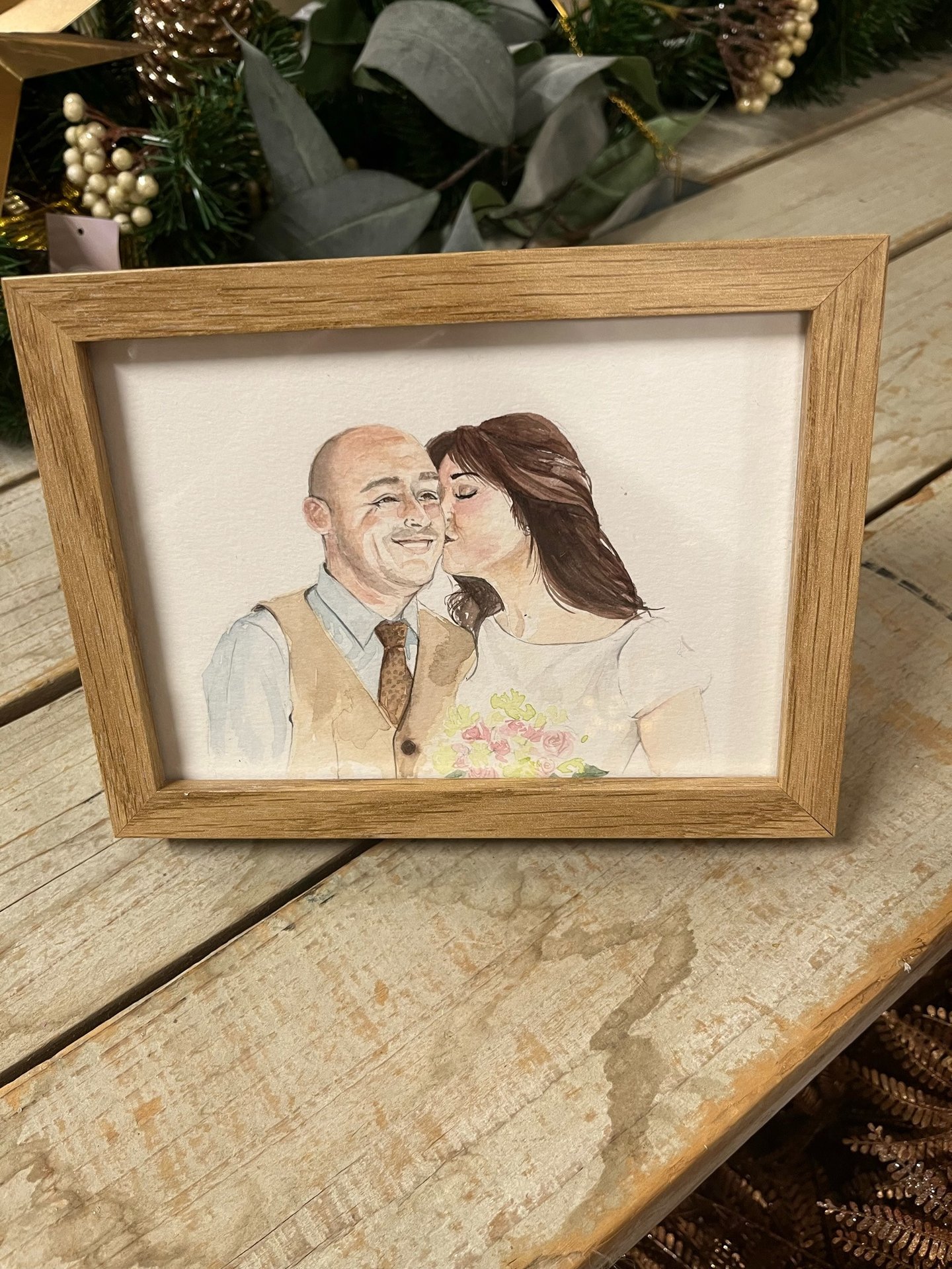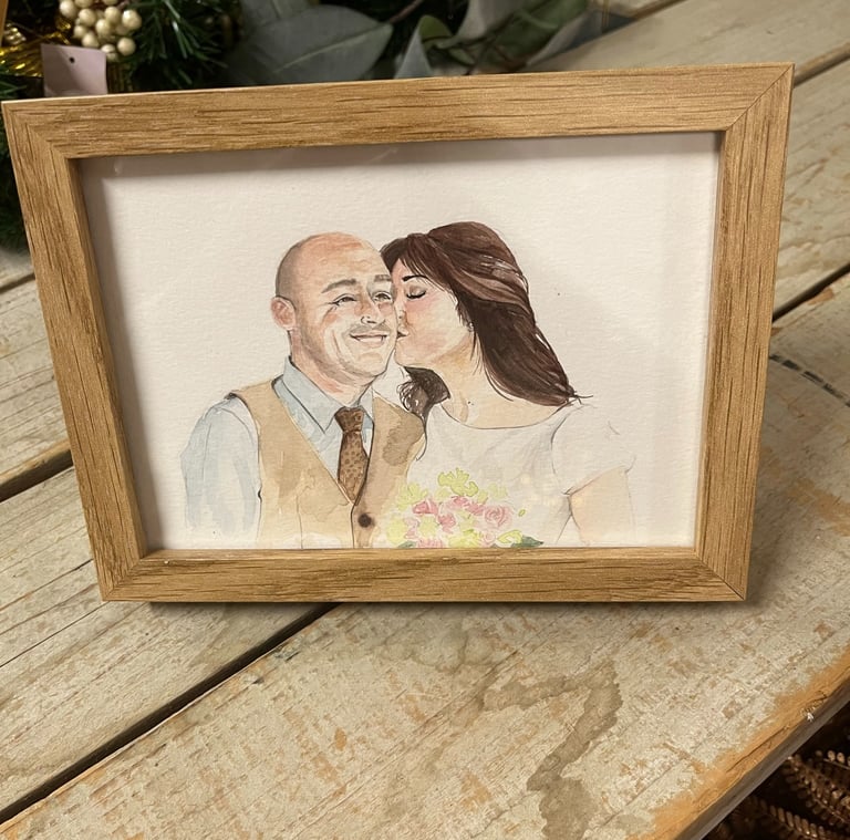 Retrato en acuarela de los novios en su día especial. Capturando la belleza y la emoción del momento.